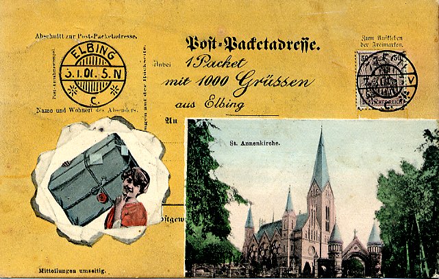 Im oberen Teil der Karte sieht man ein Panorama von Elbing, in der