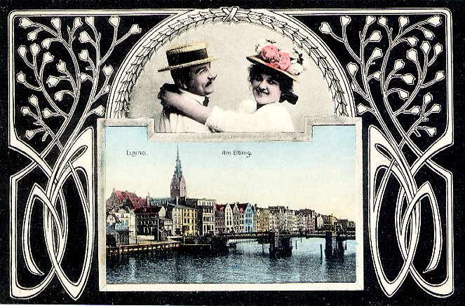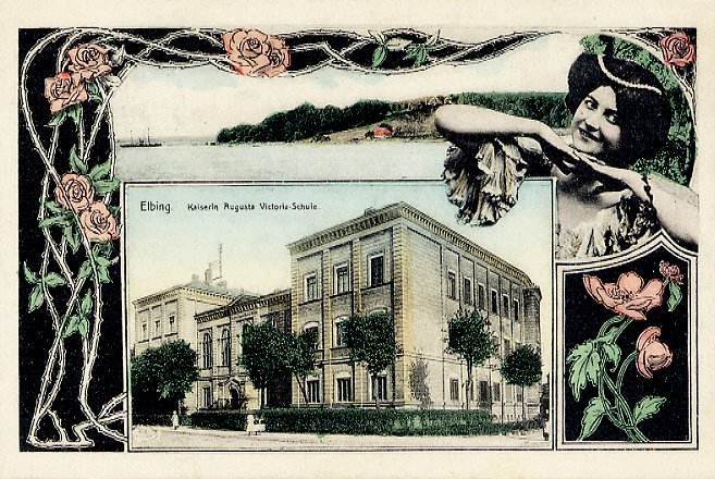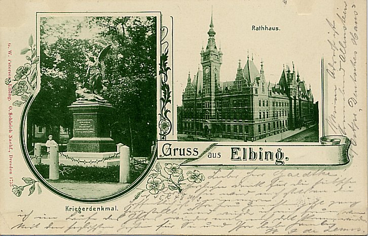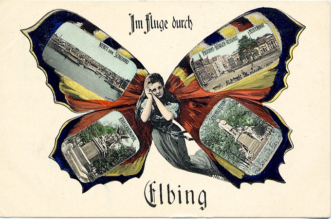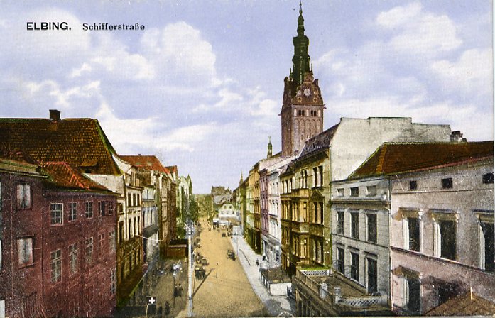 16. 6. 1918 verschickt. Auf diese Karte wurde ein falscher Straßenname aufgedruckt. Es handelt sich nicht um die Schifferstraße, sondern um die Fischerstraße. Eine Schifferstraße gibt es zwar auch in Elbing, die befindet sich aber auf der Speicherinsel.