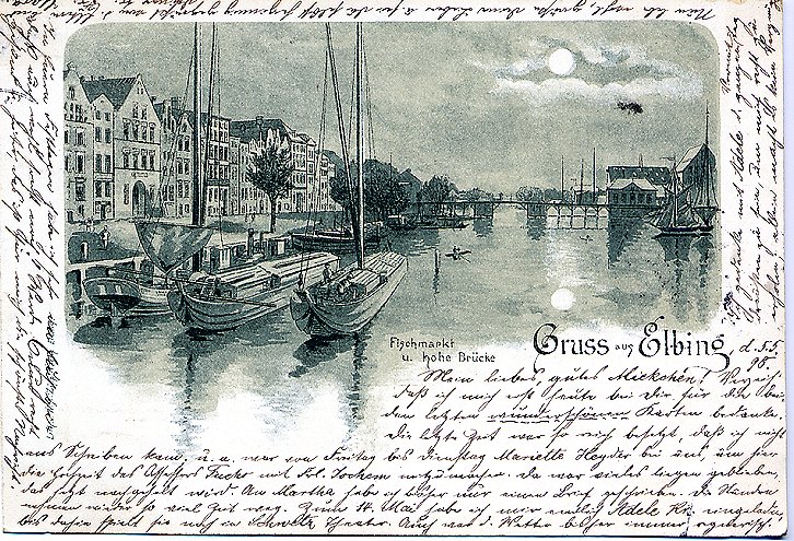 Diese sogenannte Mondscheinkarte (eine Lithographie) mit Blick auf den Fischmarkt und die Hohe Brücke, wurde am 5. Mai 1898 von Frau Clara Delion, geb. Pohl, aus Elbing an ihre Freundin Maria Gädtke (genannt Miekchen) nach Leipzig geschickt. Dieses "Miekchen" hat alle Karten, die sie im Lauf der Jahre von ihrer Freundin Clara bekommen hat, aufgehoben und so sind sie glücklicherweise auf Umwegen alle bei mir gelandet.