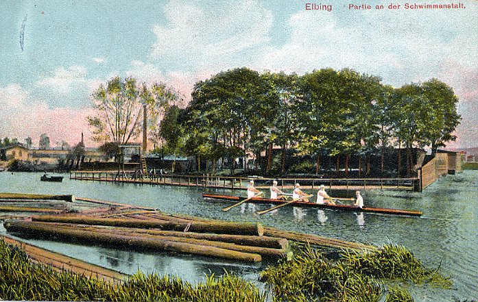 13. Diese Karte mit den Ruderern (Vierer mit Steuermann) eines Elbinger Ruderclubs ("Nautilus" oder "Vorwärts"), die gerade an der Schwimmanstalt vorbeifahren, wurde am 18. 6. 1909 gestempelt und von einer Frau Martens an ihren Mann in Berlin geschickt. Sie schreibt folgendes: