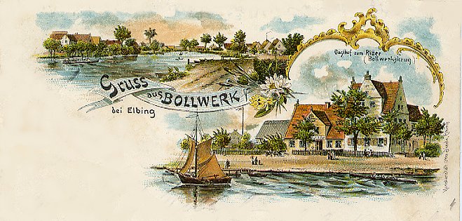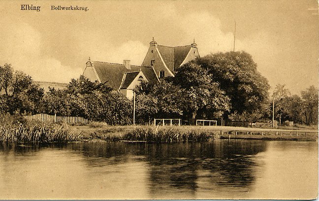 Bollwerk errichtet an der Stelle, wo damals der Fluß ins Haff einmündete, ein befestigtes Haus, das nach den Worten des Elbinger Dichters