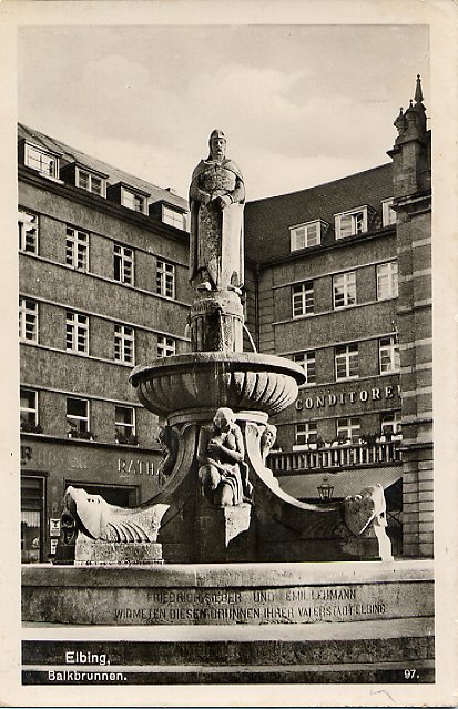 Pfeifenbrunnen der Stadt Elbing darf nur in bestimmter Reihenfolge stattfinden. Wer also an den Brunnen kommt, um Wasser zu holen, fragt