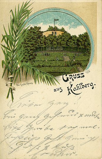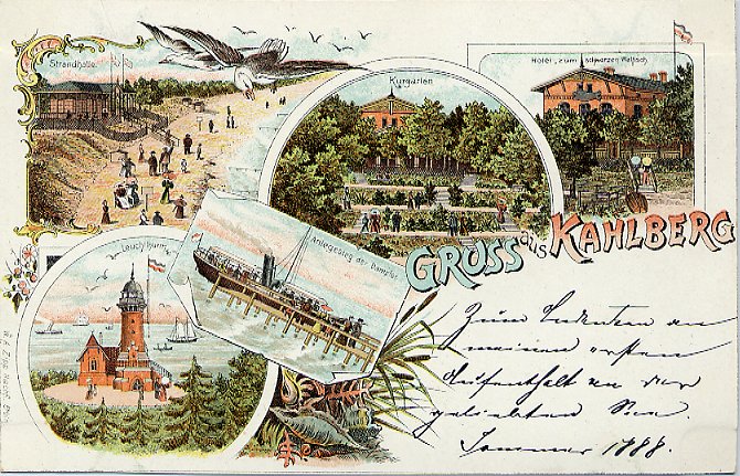 Diese mehrteilige Lithographie-Karte ist von einer Elbingerin geschrieben worden, die von 1888 - 1898 jeden Sommer in Kahlberg verbracht hat. Oben links sieht man die Strandhalle, in der Mitte den Kurgarten mit dem Belvedere, rechts das Hotel zum schwarzen Walfisch. Im Mittelteil ist der Dampferanlegesteg und links der Kahlberger Leuchtturm zu sehen.
