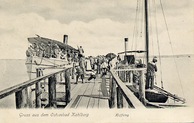 Es gab aber eine Zeit in den Vierziger und Anfang der Fünfziger Jahre des 19. Jahrh., als der große Haffsteg noch nicht existierte. Dann mussten die Dampfergäste mittels Fischerbooten an Land gebracht werden. Die mit Gästen beladenen Boote konnten aber wegen des nach dem Ufer zu immer flacher werdenden Wassers nicht bis an das trockene Land fahren. Die Fahrgäste mussten dann von den Fischern auf dem Rücken durch das seichte Wasser ans Ufer getragen werden. Für Damen mit Krinolinen (Reifröcken) war das eine nicht ganz einfache Sache.