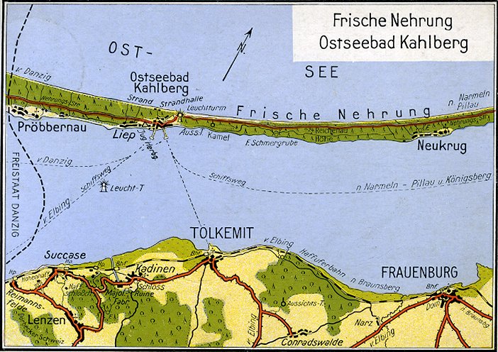 1. Frische Nehrung: Kartenausschnitt von Pröbbernau, Liep und Kahlberg bis Neukrug