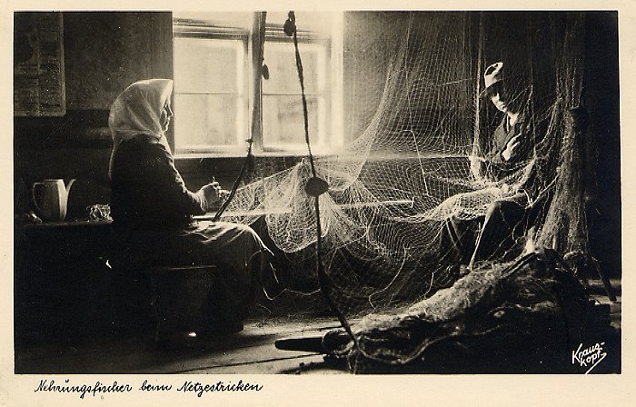 Der Nehrungsfischer fertigte sich seine Geräte für den Fischfang zum Teil noch selbst an. Zuletzt spann der Fischer nicht mehr Flachs, wie vor dem 1. Weltkrieg, zum Garn seiner Netze, sondern er ließ sich Baumwolle kommen, die wegen ihrer Schmiegsamkeit  gegenüber dem Flachsfaden bevorzugt wurde. Die Technik des "Netzknittens" aber war die gleiche geblieben, wie in früheren Zeiten.
