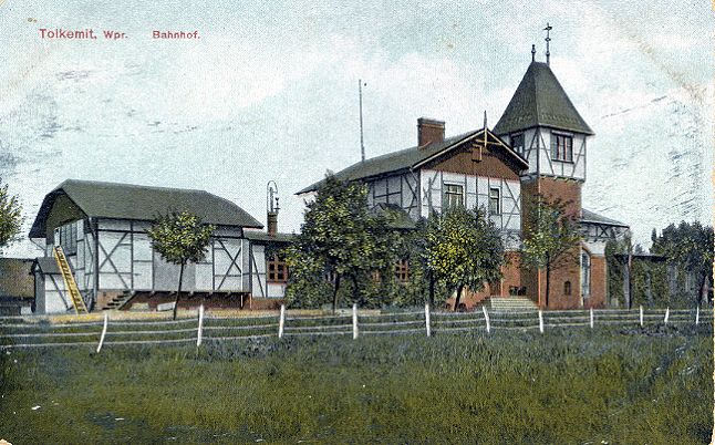 ![]() Bild 38: Partie am Marktplatz - aus einem anderen Blickwinkel, ca. 1910 Mit dem Eisenbahnanschluss durch die Haffuferbahn (HUB) im Jahre 1901 kamen noch mehr Hotelgäste nach Tolkemit ![]() Bild 39: Diese Ansichtskarte vom Haffuferbahnhof entstand etwa um 1919 ![]() Bild 40: Auf dieser Tolkemiter Karte sieht man den Haffuferbahnhof und zwei Wagen der Haffuferbahn. Die Bahnstrecke verläuft von Elbing nach Frauenburg und Braunsberg am Frischen Haff. Da das Fahrgastaufkommen in der heutigen Zeit sehr gering ist, fährt jetzt statt einer Lok mit mehreren Waggons nur noch ein Schienenbus und ab und zu ein Nostalgiezug.