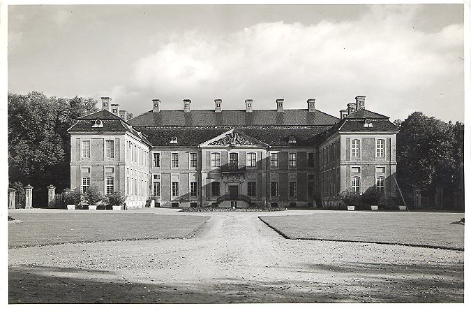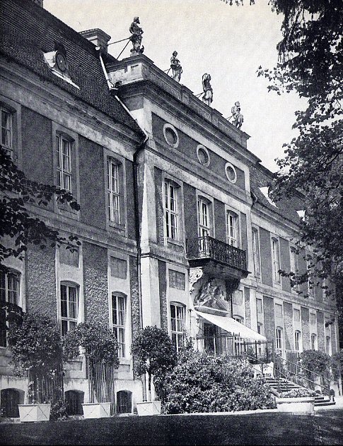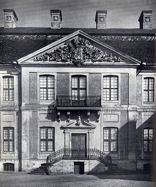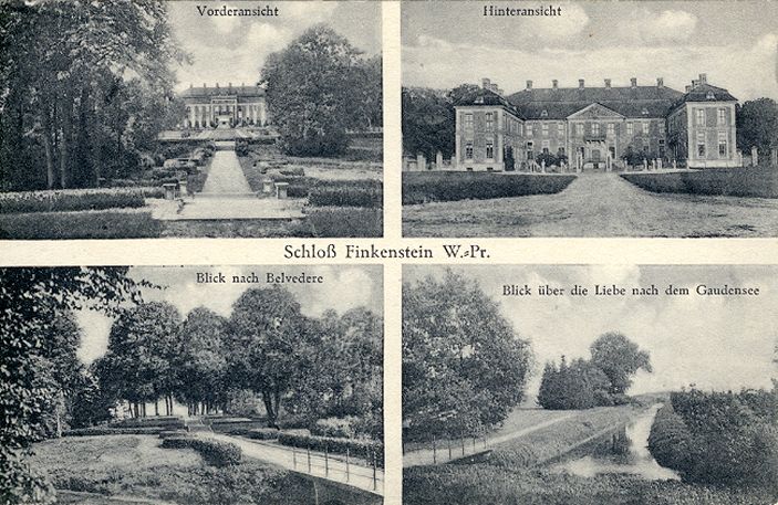 Westrisalits. In diesem mächtigen Dreiecksgiebel befinden sich Sandsteinskulpturen in guter Bildhauerarbeit: In der Mitte das große Wappen des Marschalls, beiderseits von zwei aufgerichteten widersehenden Löwen mit Bannern gehalten, inmitten von Trophäen, Feldzeichen, Waffen, Köchern, Fahnen, Trompeten, Geschützrohren und Kugeln. Das Finckensteinsche Wappen ist gevierteilt und mit einem Herzschild belegt. Der Mittelschild zeigt das Stammwappen, zwei schlanke, von einander abgewendete Halbmonde, die sich berühren, überhöht von einem achtstrahligen Stern. Im ersten und vierten Viertel ein aufgerichteter nach links (heraldisch nach rechts) gewendeter Löwe, im zweiten und dritten eine Blätterkrone. über dem Schild die Grafenkrone mit neun Perlen, besetzt mit zwei gekrönten Helmen, der erste (heraldisch rechte) mit den Halbmonden und dem Stern, der andere mit einem Doppeladler. Über dem Wappenaufbau ein breites gewelltes Schriftband, mit dem Wahlspruch des Bauherrn: EX DURIS GLORIA. Unter dem Wappen hängt das Kreuz des preußischen Schwarzen Adlerordens an der um den Schild geschlungenen Kette des Ordens. Bild 13: Risalit der Ostfront Die Risalite (Gebäudevorsprünge) im einzelnen werden durch die Treppen und Portale, durch die Balkone und einen reichen Skulpturenschmuck hervorgehoben. Der Vorbau der Gartenfassade ist anders ausgeführt als der Hofrisalit. Auf den Giebelschrägen über der Tür liegen beiderseits der Schmuckvase zwei lebensgroße allegorische Frauenfiguren. Die rechte Gestalt verkörpert, mit zwei Büchern in der Hand, die Historie (Geschichte). Die Deutung der linken Frauenfigur ist zweifelhaft, weil die rechte Hand abgesplittert ist und man leider nicht mehr weiß, was sie einmal in der Hand gehalten hat. Der obere Teil des Gartenrisalits an der Ostfront hat keinen Dreiecksgiebel, sondern trägt eine hoch hinaufgeführte Attika. Sie baut sich über einen Untersatz mit drei Rundfenstern auf einem stark ausladenden Gesims auf, das eine Reihe von vier gedrungenen Pfeilern trägt. Sie sind die Postamente für vier lebensgroßen Sandsteinfiguren. Außen sind beiderseits zwei bärtige Männergestalten dargestellt, zwischen ihnen zwei Frauen. Sie sollen die vier Jahreszeiten verkörpern. Bild 14: Ostportal mit Balkon Bild 15: Diese Kupfertiefdruckkarte wurde am 22.10.1928 in Elbing gestempelt und nach Stuttgart geschickt.