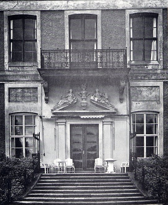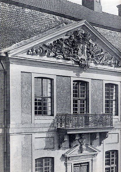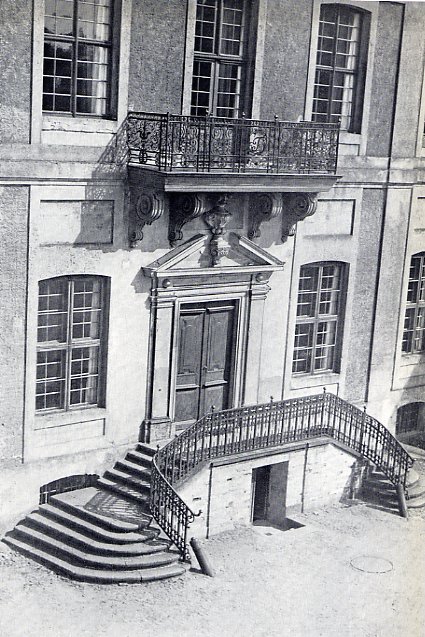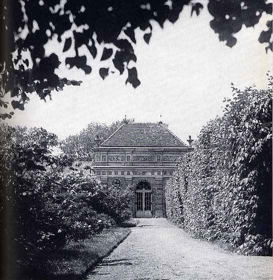 Mitte wie der Balkon der Gartenfront ein großes ornamentales "F." Bild 12: Balkon und Skulpturengiebel des