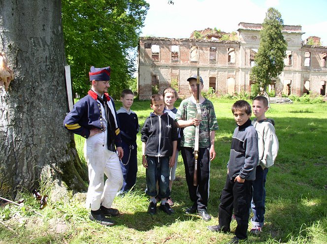Soldat in alter Uniform mit Kindern im einstigen Schlosspark