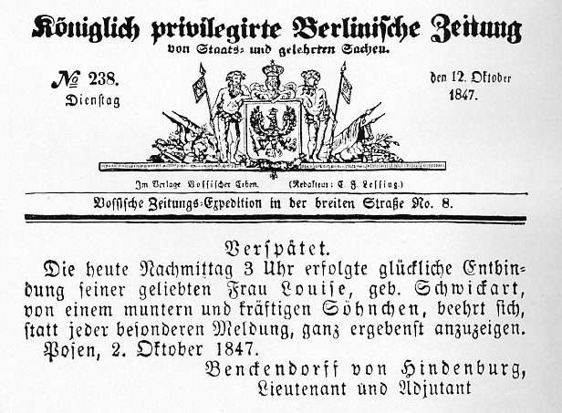 von Hindenburg empfing wohl seine ersten Eindrücke als Vierjähriger in