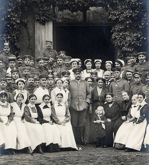 Foto Nr. 28:  Generalfeldmarschall von Hindenburg mit den Schwestern und Verwundeten im Reservelazarett in Pinne (17.2.1915). Bei dem Gebäude handelt es sich um das in ein Diakonissenkrankenhaus umgewandelte einstige Elternhaus Hindenburgs.