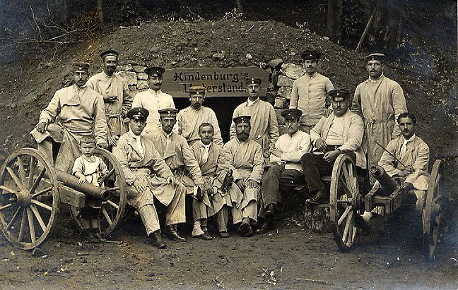 Foto Nr. 32:  Hier sieht man eine Gruppe verwundeter Soldaten vor Hindenburg's Unterstand. Diese Fotopostkarte trägt einen Stempel des Königlich Preußischen Reservelazaretts von Sangershausen und wurde am 2.7.1915 abgeschickt. Sangershausen liegt in der Gemeinde Neu Kußfeld im Landkreis Preußisch-Holland.