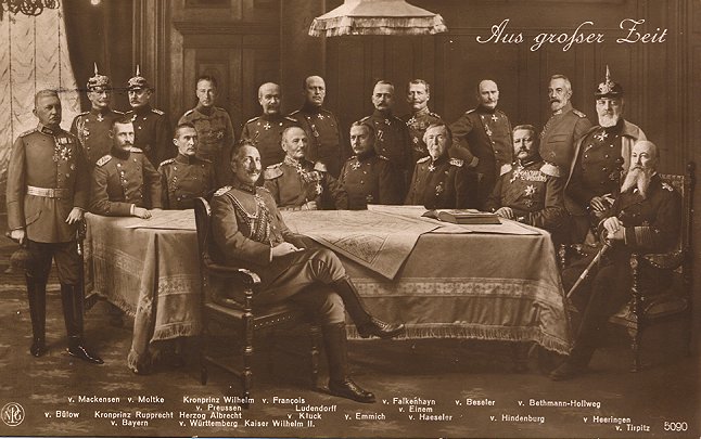 stehend von links nach rechts: v. Bülow, v. Mackensen, v. Moltke, Kronprinz Wilhelm von Preußen, v. Francois, Ludendorff, v. Falkenhayn, v. Einem, v. Beseler, v. Bethmann-Hollweg, v. Heeringen.