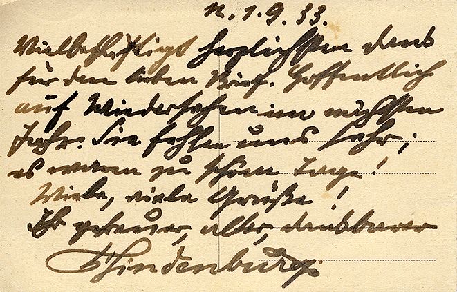 Bild 43 + 44: Diese Ansichtskarte schrieb Hindenburg ein knappes Jahr vor seinem Tod (1.9.1933)