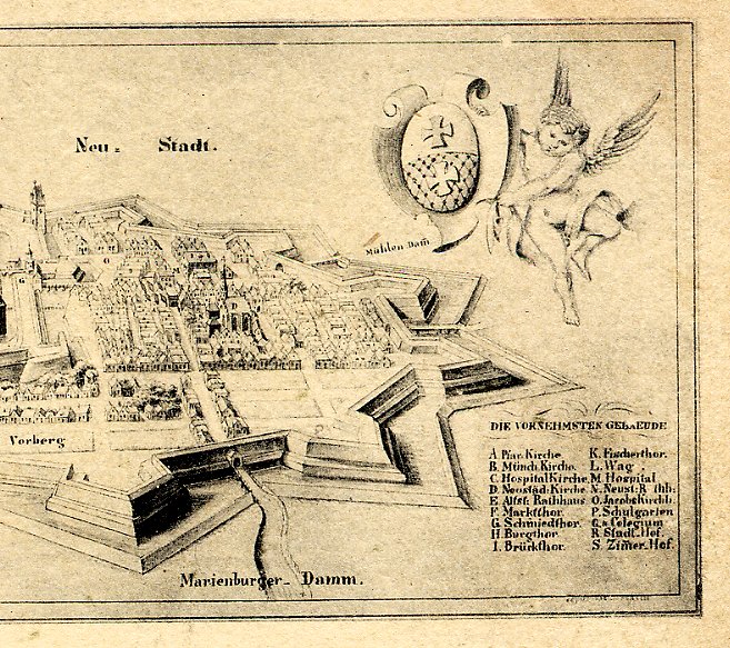 Mühlen-Damm. Der kleine Putte trägt das Elbinger Stadtwappen.