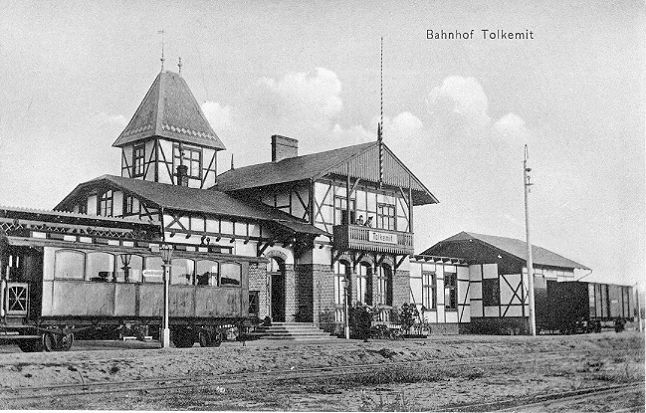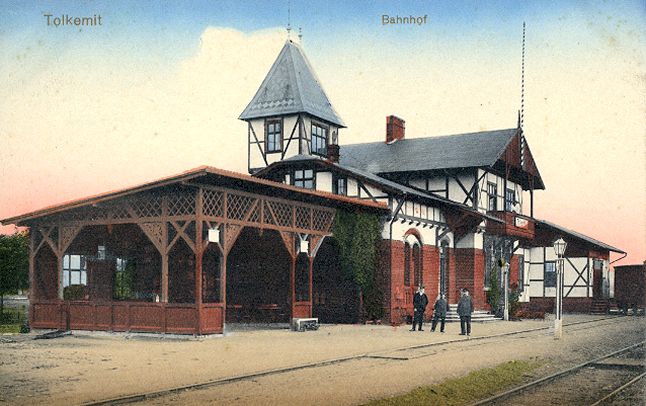 ![]() Bild 38: Partie am Marktplatz - aus einem anderen Blickwinkel, ca. 1910 Mit dem Eisenbahnanschluss durch die Haffuferbahn (HUB) im Jahre 1901 kamen noch mehr Hotelgäste nach Tolkemit ![]() Bild 39: Diese Ansichtskarte vom Haffuferbahnhof entstand etwa um 1919 ![]() Bild 40: Auf dieser Tolkemiter Karte sieht man den Haffuferbahnhof und zwei Wagen der Haffuferbahn. Die Bahnstrecke verläuft von Elbing nach Frauenburg und Braunsberg am Frischen Haff. Da das Fahrgastaufkommen in der heutigen Zeit sehr gering ist, fährt jetzt statt einer Lok mit mehreren Waggons nur noch ein Schienenbus und ab und zu ein Nostalgiezug.