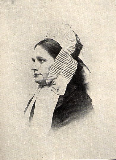 Tuch geschlagen wurde. Wohlhabendere jüngere Frauen trugen schwarzseidene Mützen, seidene farbige Tücher und Schürzen.
