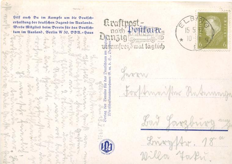 Vom 14. bis 16. Mai 1932 – zu Pfingsten – fand in den 1920 deutsch gebliebenen westpreußischen Städten Danzig, Elbing und Marienburg die damals traditionelle große Pfingsttagung des Vereins für das Deutschtum im Ausland, allgemein als V.D.A. bekannt, statt. Die Hauptveranstaltungen wurden in Elbing durchgeführt. Das lag wahrscheinlich daran, daß die Aufnahmekapazität Marienburgs wesentlich kleiner war und das deutsche Danzig außerhalb der Reichsgrenzen lag.