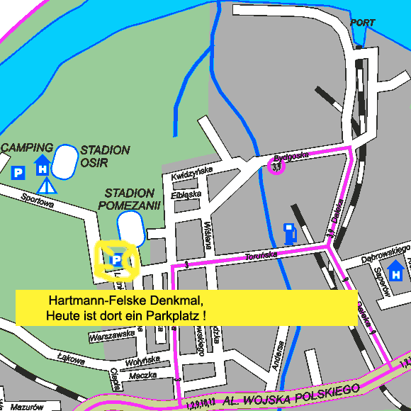 Nach nochmaliger Rücksprache mit dem Heimatforscher Dr. Rainer Zacharias, der das Marienburger Heimatbuch geschrieben hat, habe ich nun in einen aktuellen Stadtplan von Marienburg eingetragen, wo sich das Hartmann-Felske Denkmal befand.