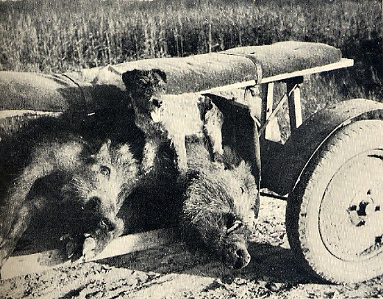 mit Achsen von einem alten kleinen "Laubfrosch", Dixi oder DKW. Bild 9: Man verwendete sie auch zum Abtransport der Jagdbeute Bild 10: Sika, der kleinste Hirsch mit dem Dackel des Grafen So einen Jagdhund konnte man nicht nur zum