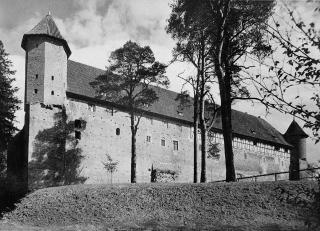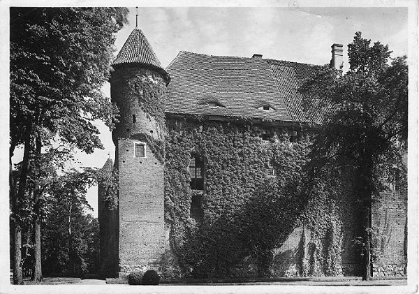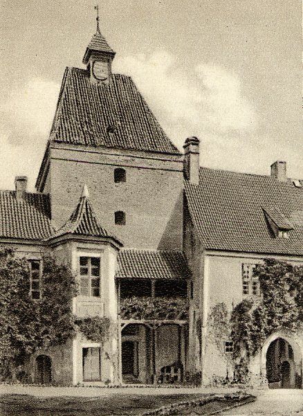 Vom Hof aus gelangte man in die Zimmer und Säle, und jeder Fremde war zunächst verblüfft, wenn er dann auf der anderen Seite von den Fenstern nach dem Park und dem Haussee hinaussah. Parterre war man doch hereingekommen und hier schien man sich im dritten Stockwerk zu befinden, denn die Fenster lagen ca. 15 m hoch über dem Fundament. Dieser Block war, wenn die Zugbrücke hochgezogen war, uneinnehmbar. Später baute man statt der Zugbrücke eine massive Brücke.