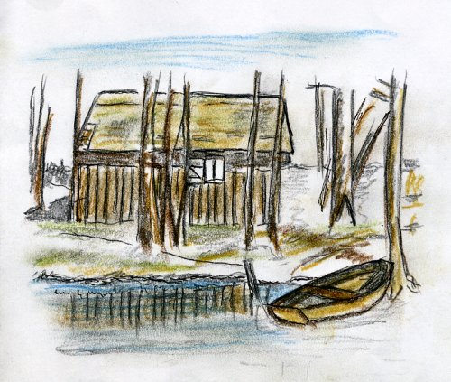 Drewenzsee. In den Schilfstreifen lärmten die Blässhühner. Die
