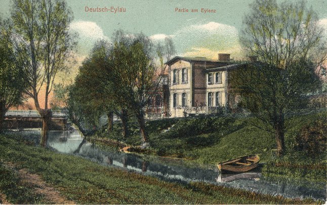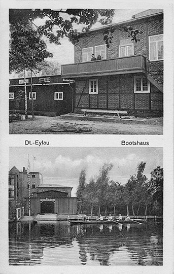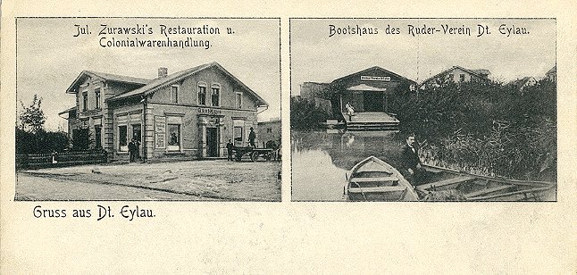 Colonialwarenhandlung (links) und dem Bootshaus des Ruder-Vereins Dt.-Eylau